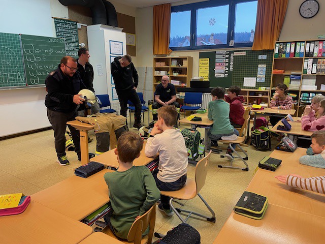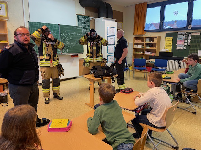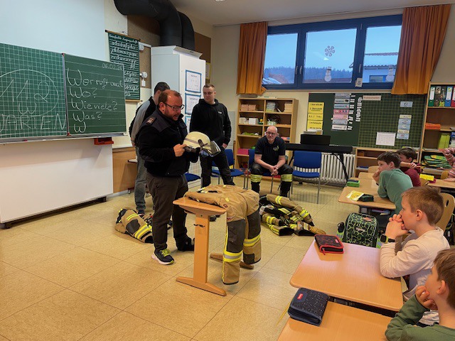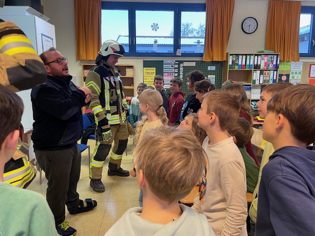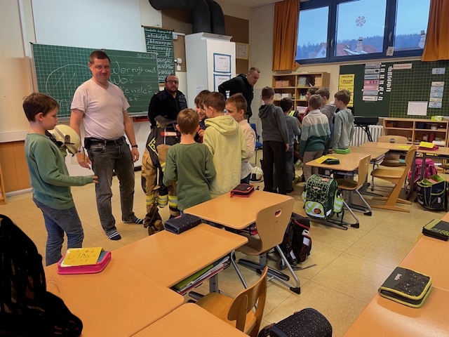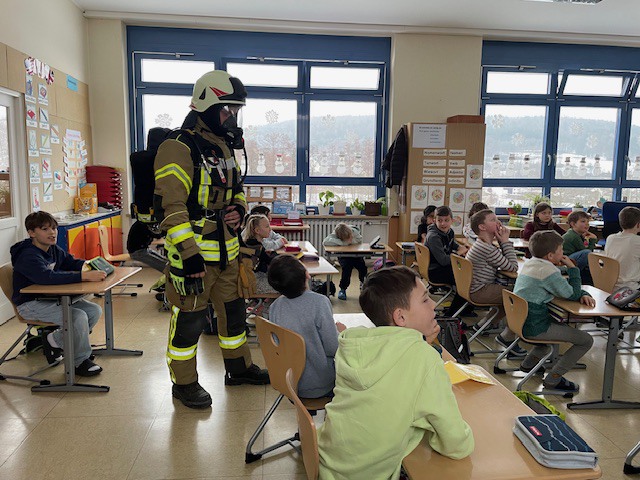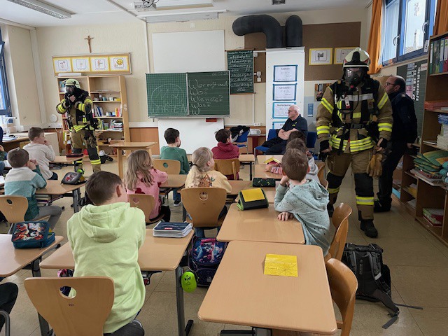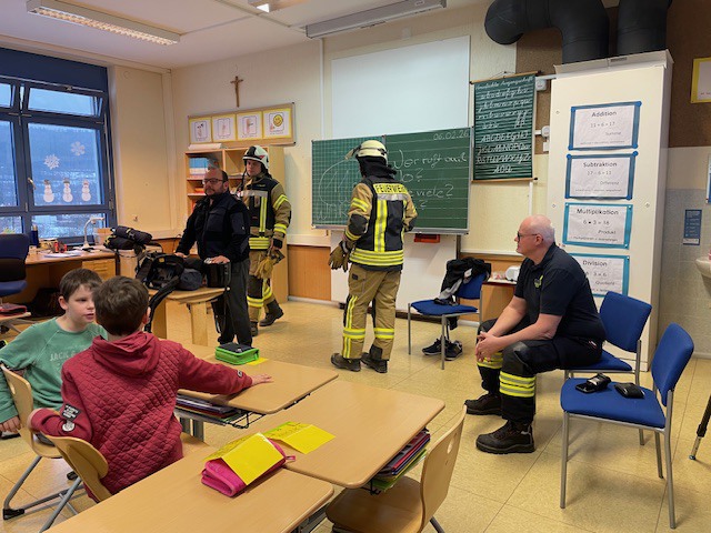 Und endlich, um 8.00 Uhr betraten vier Feuerwehrkameraden in voller Montur das Klassenzimmer.