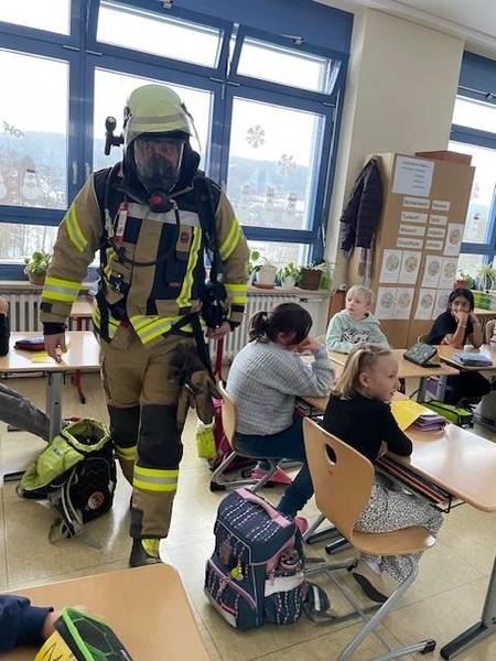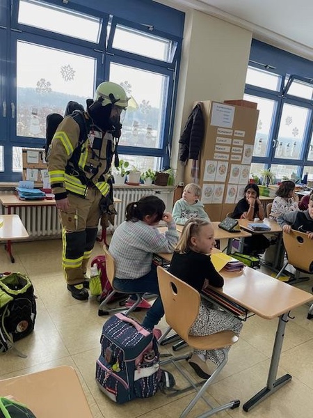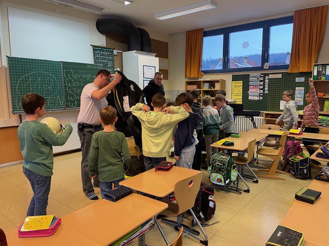 Mucksmäuschenstill war es, als sich die zwei Figuren langsam im Halbdunkel des Klassenzimmers durch die Tischreihen der Kinder hindurchbewegten und gleichzeitig das leise säuselnde Geräusch der Masken zu hören war. Die Intention dieser Demonstration lag besonders darin, den Kindern die Angst vor den Feuerwehrleuten mit Atemschutz-ausrüstung zu nehmen. Mehrmals betonte Herr Karwacki, dass die Kinder bei einem echten Notfall sich nicht verstecken, sondern auf die Helfer zugehen sollten.