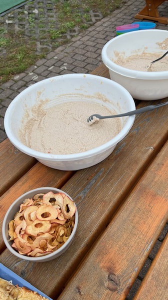 Im Schulhaus gab es vier verschiedene Stationen zum Thema Äpfel. Mit vereinten Kräften wurde frischer Apfelsaft gepresst und herrlich duftender Apfelkuchen gebacken, sowie Bircher Müsli zubereitet. Außerdem konnten die Kinder den Apfel mit allen Sinnen erfahren, also schmecken, riechen, fühlen und hören und es gab die Möglichkeit Apfelringe zu dörren.
