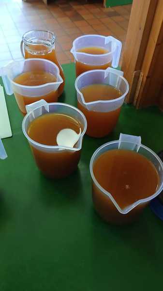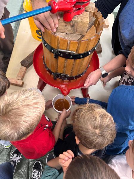 Die Klassen 1/2e und 1/2f sammelten am Mittwoch schon fleißig die Äpfel ein und am Donnerstag wurden sie dann von den Klassen 3c und 4d gewaschen und gehäckselt, sodass sie am Freitag einsatzbereit waren.